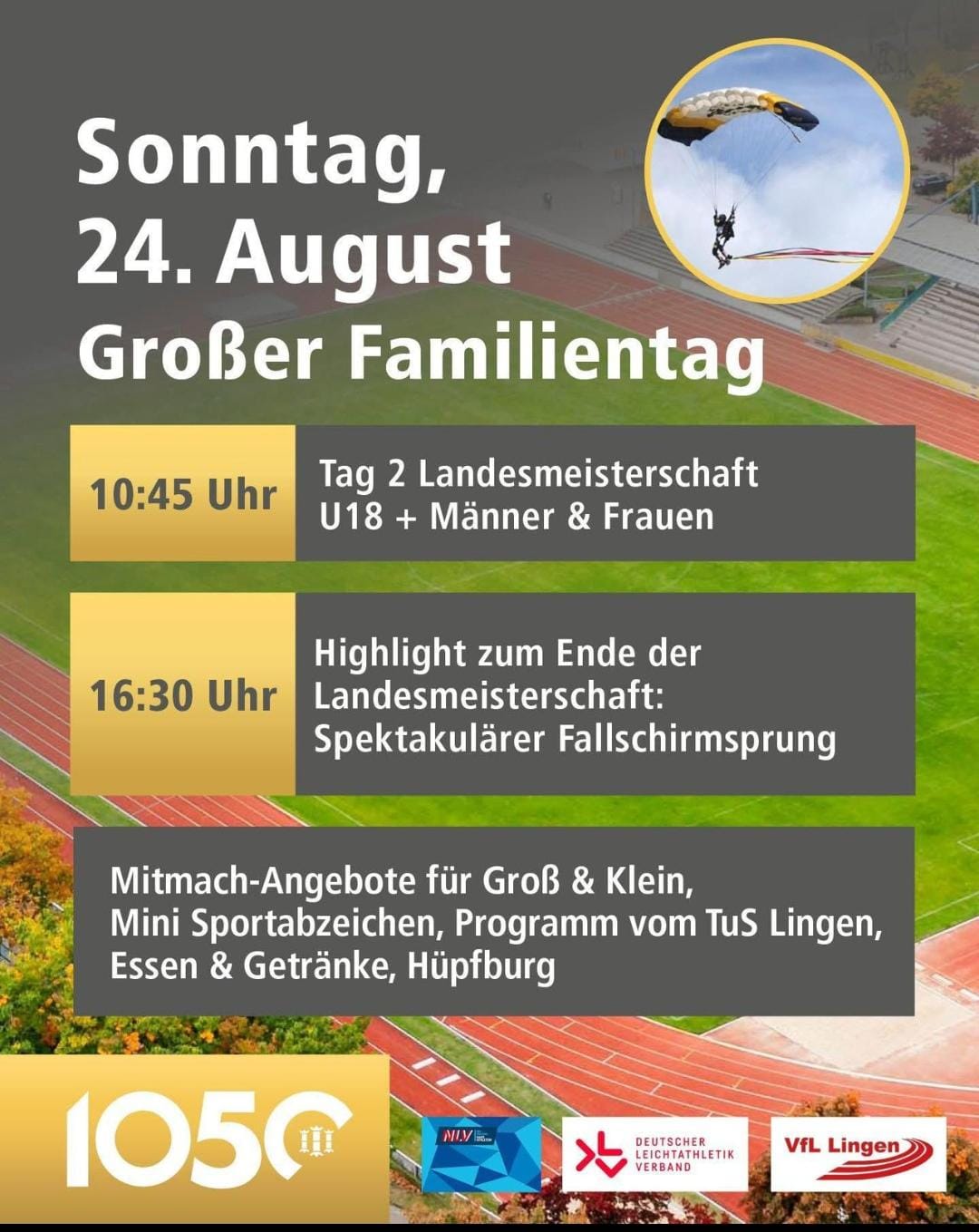 Während der Landesmeisterschaften wird der VfL Lingen am Sonntag zudem ein großes Familien- und Mitmach-Angebot bereitstellen (Mini Sportabzeichen, Hüpfburg etc.).