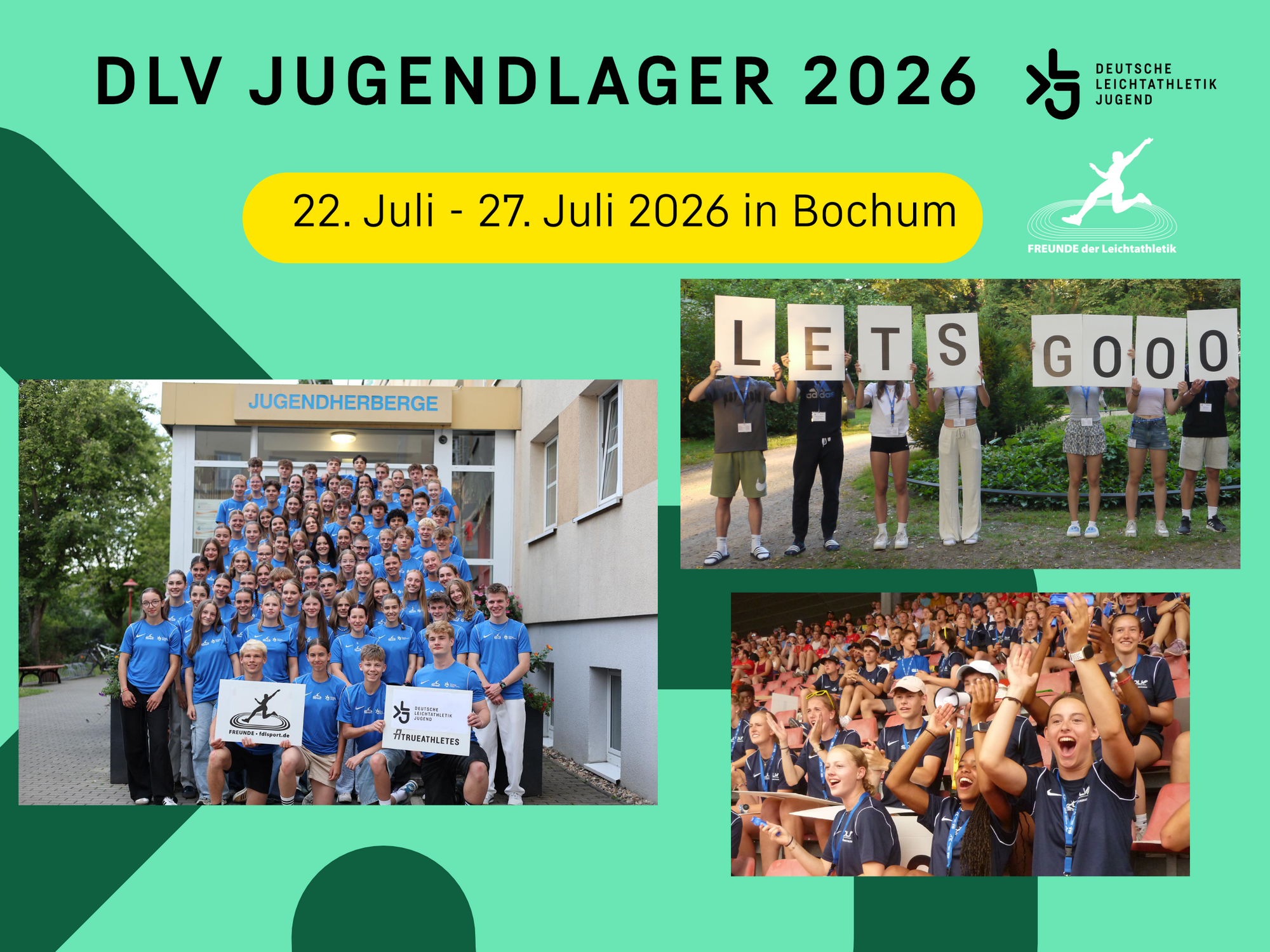 Anlässlich der Deutschen Meisterschaften findet das DLV-Jugendlager vom 22. Juli – 27. Juli 2026 mit der Unterstützung des Vereins „Freunde der Leichtathletik“ in Bochum statt. Ziel ist es, die Gemeinschaft und das Netzwerk unter jugendlichen Leichtathlet:innen zu fördern. Dazu beitragen sollen gemeinsame Trainingsmöglichkeiten und Freizeitaktivitäten sowie der Besuch der Deutschen Leichtathletik-Meisterschaften der Aktiven. Für die Teilnehmer:innen sollte das Jugendlager Anerkennung ihrer sportlichen Leistungen oder ehrenamtlich geleisteter Jugendarbeit sein.