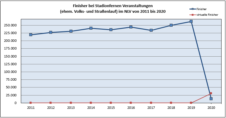 Im Jahr 2020 überquerten insgesamt 13.196 Finisher die Ziellinie bei einer der 57 stadionfernen (Präsenz-) Laufveranstaltungen in Niedersachsen. Bundesweit waren es insgesamt 153.577. Im Vergleich zum Vorjahr, wo in Niedersachsen der Rekord von 262.395 Finishern bei 442 Veranstaltungen aufgestellt worden ist, zeigen sich die schweren Folgen der Pandemie. Insgesamt 375 Präsenzveranstaltungen mussten abgesagt werden. 15 Vereine und Veranstalter haben trotz der Beschränkungen einen teils aufwendigen Weg gefunden, ihre Veranstaltungen unter Einhaltung geltender Bestimmungen durchführen zu können. Während die Finisher bei Präsenzveranstaltungen aufgrund der anhaltenden Situation erheblich zurückgingen, haben eine Vielzahl von Vereinen und Veranstaltern der Laufcommunity ein Alternativangebot durch die Initiierung virtueller Läufe präsentiert. Ca. 30.000 Finisher wurden 2020 bei knapp 50 virtuellen Veranstaltungsformaten in Niedersachsen gezählt.