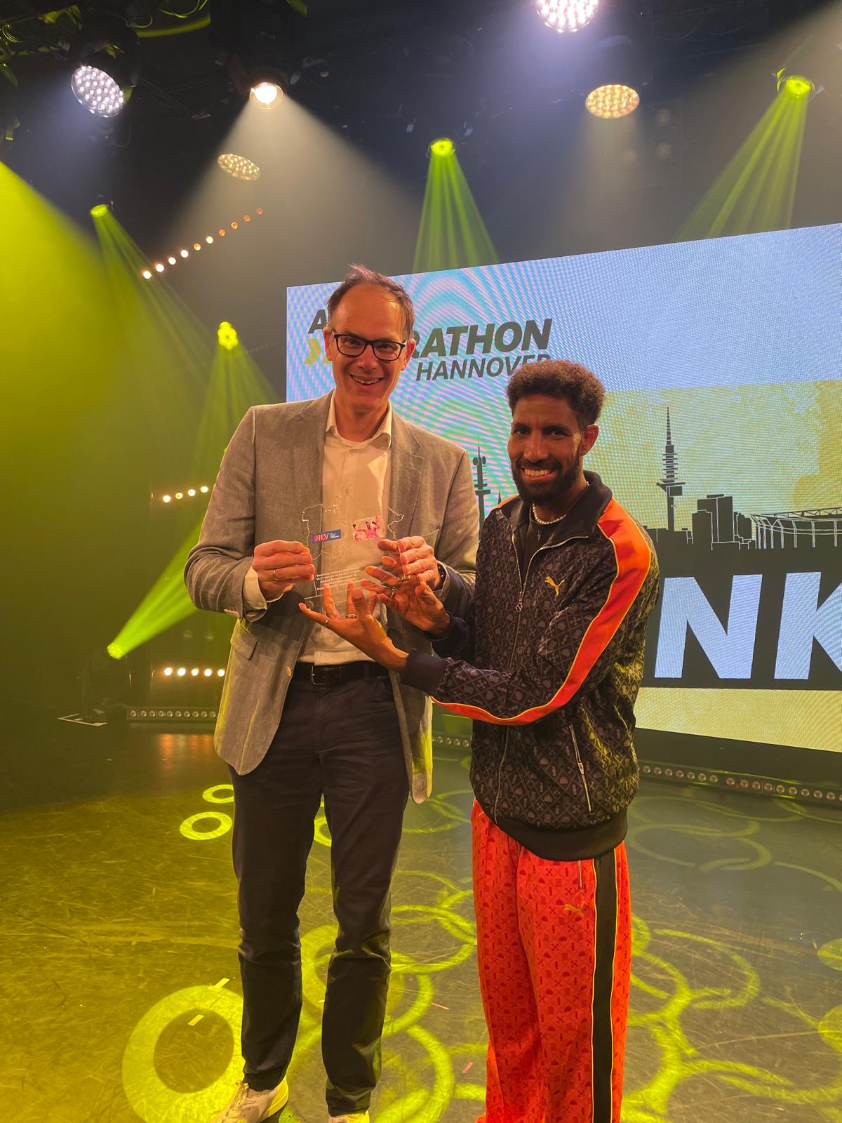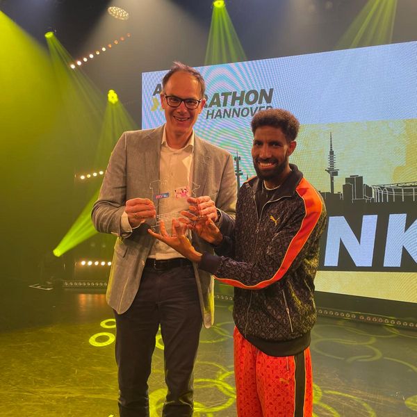 Für diesen neu aufgestellten Deutschen Rekord wurde Amanal Petros, der seit diesem Jahr für Hannover 96 an den Start geht, im Rahmen einer Veranstaltung des ADAC Marathons Hannover nachträglich ausgezeichnet. Ingo Schultz – Vizepräsident Leistungssport im Niedersächsischen Leichtathletik-Verband – übergab dem Top-Läufer am vergangenen Montag im GOP-Theater in Hannover die Auszeichnung und würdigte die Leistung des 30-Jährigen. Petros fand dankende Worte für den Support: „Die Überraschung ist euch wirklich gelungen. Das ehrt und motiviert mich ungemein“, erklärte er auf der Bühne.