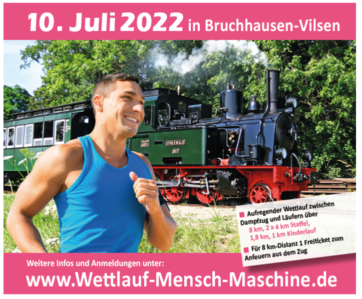 Die Anmeldung für den diesjährigen 5. Wettlauf „Mensch gegen Maschine“ am 10. Juli 2022 in Bruchhausen-Vilsen ist bereits möglich. Tipp: Bis 19.04.2022 anmelden und von vergünstigten Startgebühren profitieren.