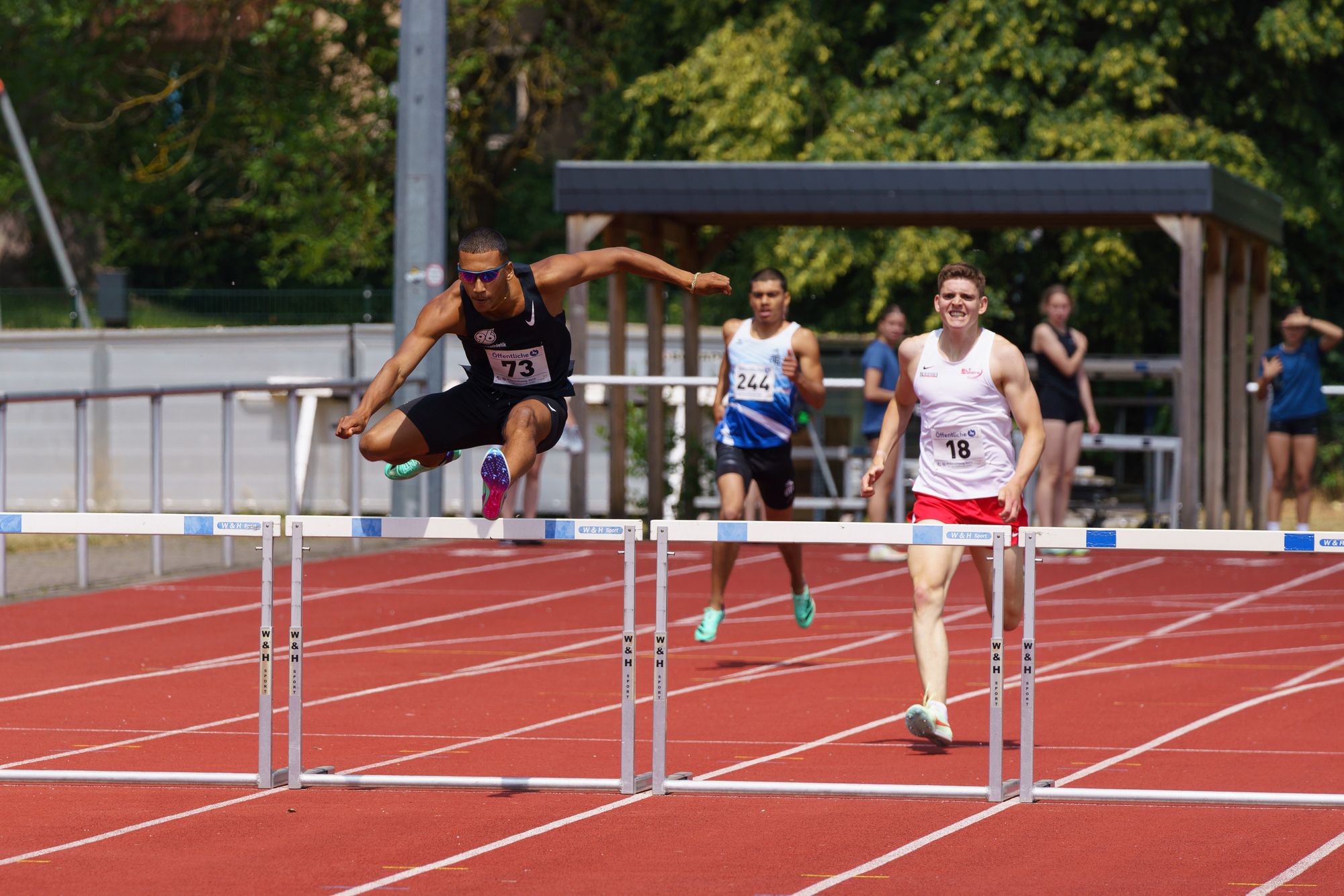 Die DLV-Dritte Sandy Sakyi (SV Werder Bremen) gewann ihre 100 m Hürden bei einem engen Finish nur knapp vor der DLV-Sechsten Savanna-Sara Wölfer (TK zu Hannover). Beide erzielten neue PB mit 13,80 bzw. 13,86 Sekunden.