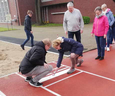 Nach einem theoretischen Teil, in dem die aktuellen Regeländerungen vermittelt wurden, ging es an die Weitsprunggrube. Es wurde ein Kampfrichter-Team gebildet, die einzelnen Aufgaben erläutert und Situationen der Messung ohne Hilfsmittel wie Videotechnologie oder Plastillin simuliert. Eine schwierige Aufgabe, bei der sich die am Brett gegenüberstehenden Kampfrichter bei der genauen Markierung der Absprungstelle nicht immer einig waren.