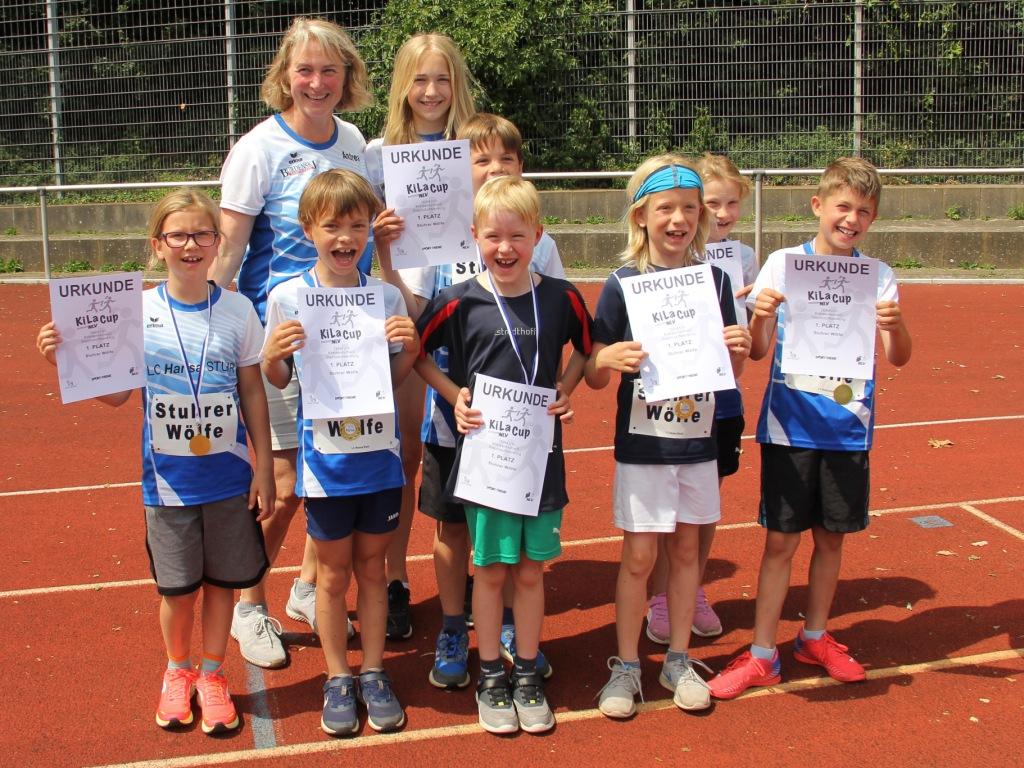 Bei der Neuauflage des KiLa-Cup-Kreisentscheides Diepholz/Nienburg beteiligten sich ca. 80 Kinder aus 10 Teams. Die gemischten Mannschaften aus 7- bis 9-jährigen Jungs und Mädchen gaben sich selbst einen Namen und traten in vier Disziplinen bei strahlendem Sonnenschein in Moordeich gegeneinander an. Zu absolvieren waren die Hindernissprint-Staffel (40 m Hindernis- und Flachsprint), die Weitsprung-Staffel mit Zonenweitsprüngen in drei Minuten, der Drehwurf mit einem Wurfring und der 7-minütige Transportlauf. Belohnt wurden die Kinder mit Medaillen, Urkunden und einem wohlverdienten Eis. Das Siegerteam konnte sich zusätzlich über die blauen Sieger-Shirts freuen.