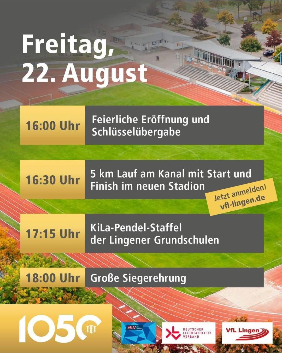 Neben den zweitägigen Titelkämpfen, bei denen erstmalig die 4x100 Meter Mixed-Staffel als Rahmenwettbewerb ausgetragen werden (wir berichteten), wird es auch ein umfangreiches Rahmenprogramm geben. Bereits am Freitag (22.08.) wird das Eröffnungswochenende mit einem 5km Lauf mit Start und Finish im neuen Stadion feierlich eingeläutet. Noch bis Ende dieser Woche kann sich für diesen Lauf für nur einen Euro angemeldet werden (Anmeldung). Die gesamten Startgelder und Spenden werden dabei 1:1 an das Kinderhospiz Löwenherz Lingen weitergegeben. Abgerundet wird der Freitag im Anschluss mit der Kinderleichtathletik-Pendel-Staffel der Lingener Grundschulen.