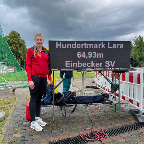 Am Samstagnachmittag ließ Lara Hundertmark vom Einbecker SV in der weiblichen U23 mit einem starken Wettkampf aufhorchen: Mit 64,93 m übertraf sie nicht nur ihre bisherige PB deutlich, sondern auch die U23-EM-Norm von 64,50 m – am Ende Platz 2 und eine stabile Serie um die 63 m.