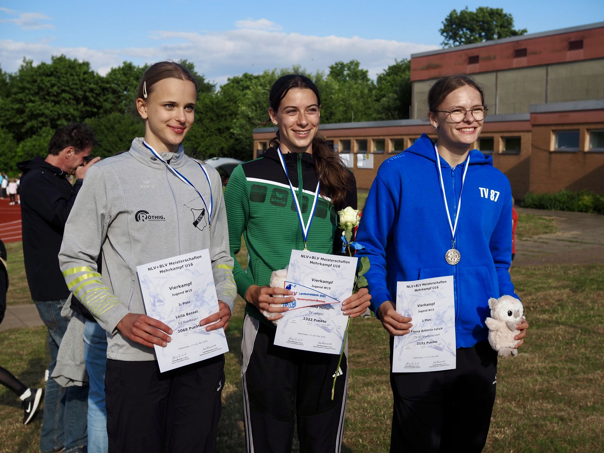 Sowohl den Vier- als auch den Siebenkampf der W15 machten an diesem Wochenende drei Athletinnen unter sich aus: Tamina Heller vom TV Langen krönte sich an beiden Tagen zur Landesmeisterin. Im Vierkampf sicherte sich Fiona Antonia Lucya vom TV 87 Stadtoldendorf mit 2.171 Zählern vor Leila Bessel (SV Nienhagen) Rang zwei – im Siebenkampf allerdings musste sie sich von Bessel, die mit 3.606 Punkten eine neue persönliche Bestleistung auf ihr Konto verbuchte, geschlagen geben.