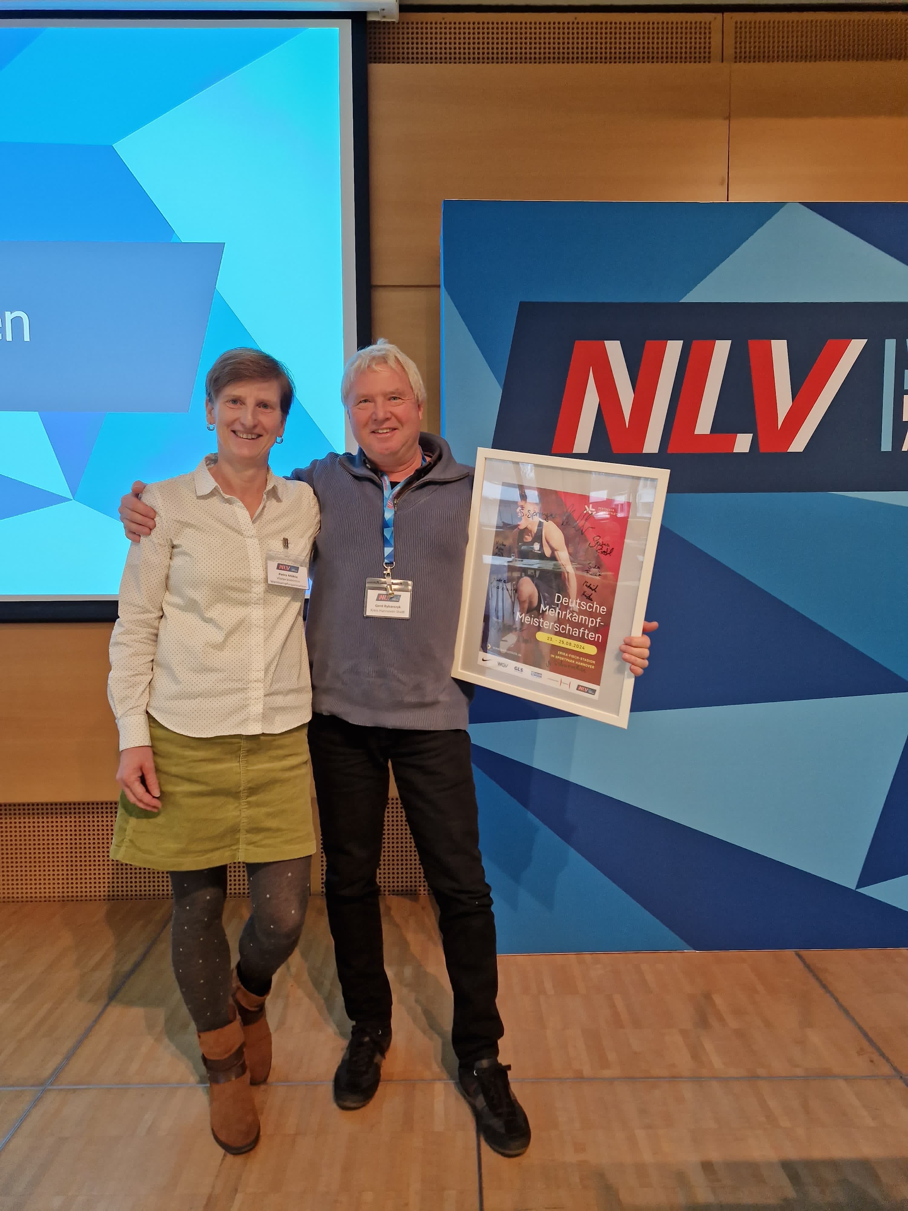 Die Bühne frei machte Schünemann zwischenzeitlich aber auch für die neuen Mitarbeiter*innen des NLV: Sowohl aus der Geschäftsstelle als auch aus dem Leistungssportpersonal nutzten Neuzugänge wie die diesjährigen Bundesfreiwilligendienstleistenden Charlotte Nolte und Yannick Reinecke, der als Werkstudent tätige Malik Pretzsch und der Leitende Landestrainer Marco Antoni den Moment, um sich den Ehrenamtlichen persönlich vorzustellen. Drei weitere Gesichter aus dem Trainerteam – Jaqueliné Gippner, Johannes Breitenstein und Franz Pfrepper – nutzten hierfür eine Videobotschaft. Die Treppenstufen auf die Bühne nehmen durfte zu Beginn des Vormittages auch Uwe Wartenberg: Der Vorsitzende des Bezirks Hannover und des Kreises Hannover-Land engagiert sich auch in seinem Heimatverein TSV Neustadt mit Hingabe zum Wohle der Leichtathletik und wurde als Dank hierfür durch Uwe Schünemann mit der Goldenen NLV Ehrennadel geehrt. Als Überraschung für die erfolgreiche Ausrichtung der DM Mehrkampf Ende August in Hannover überreichte Petra Möhle dem Vorsitzenden des Kreises Hannover-Stadt stellvertretend ein unterschriebenes DM-Plakat.