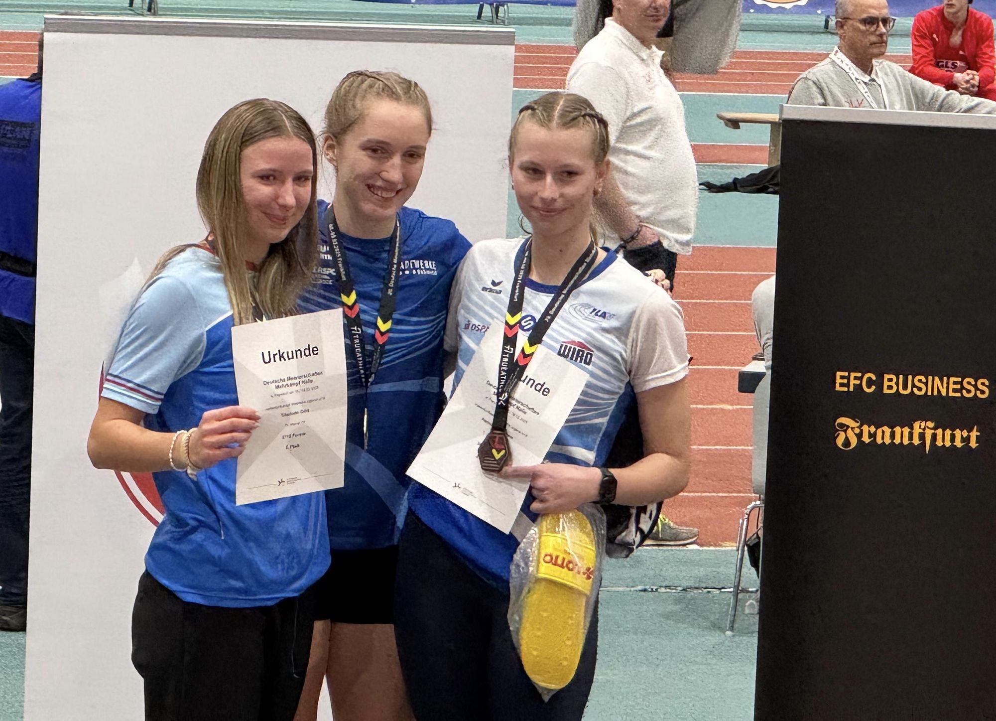 Schon über die 60m Hürden – Funcks Parade-Disziplin – wurde deutlich, dass die junge Walsroderin top in Form ist: Sie überquerte nach 8,43sek die Ziellinie, war damit mehr als drei Zehntelsekunden schneller als ihre Konkurrentinnen und schob sich nebenbei auf Rang drei der Deutschen U18-Jahresbestenliste der Spezialistinnen. Im Hochsprung blieb die Latte bis zu einer Höhe von 1,70n liegen – ihre Hallen-Bestleistung war damit eingestellt. Nach dem Kugelstoßen, bei dem die Niedersächsin das Wurfgerät erstmals über die 12-Meter-Marke katapultierte, war schon klar: An Svea Funck kommt heute niemand mehr vorbei. Als sie dann im Weitsprung auch noch auf eine neue persönliche Bestweite von 5,86m flog, stand dann ein ganz neues Thema im Raum: Für das Unterbieten des Deutschen Rekordes brauchte es über die abschließende 800m-Distanz eine Zeit von unter 2:25,50min. Gesagt, getan: Funck dominierte die Konkurrenz auch in diesem Rennen und kämpfte sich nach 2:21,17min ins Ziel. Ihre Taktik hierbei: „Ich hatte die Zeit und die Punkte, die ich noch für den Deutschen Rekord brauchte, im Kopf. Doch als es dann los ging, wollte ich das Laufen und Wettkampf nur noch genießen und mich selbst herausfordern.“