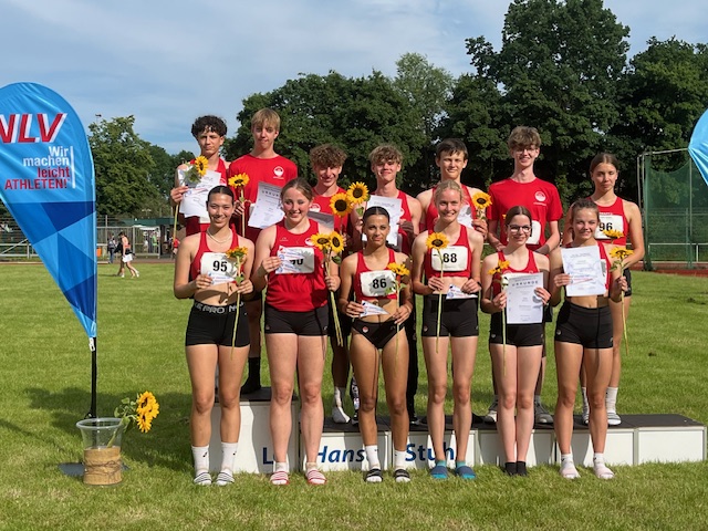 Die Siegerwimpel in dieser Mannschaftswertung sicherten sich Lara Maiwald, Niya Bödeker, Alisa Castro-Reyes, Josefine Birg und Emma Stamm von der VfL Eintracht Hannover. Die Hannoveranerinnen begeisterten mit einer Gesamtpunktzahl von 12.162 Zählern – Rang drei in Deutschland. Der SV Werder Bremen und die LG Papenburg/Aschendorf verwiesen sie damit auf den Silber- und Bronzerang. „Das war ein unglaublicher Tag. Alle haben abgeliefert!“, kam Eintracht-Coach Chris Linschmann aus dem Staunen gar nicht mehr heraus. Schließlich wurden auch die Jungs aus Hannover Landesmeister: Mit 12.886 Punkten durften Maximilian Weppler, Max Lucas, Jan Linschmann, Leo Cherkeh und Christian Kulp nach ganz oben auf das Treppchen steigen und Platz sechs auf der DLV-Bestenliste auf ihr Konto verbuchen.