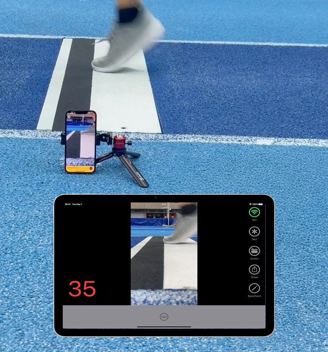 Die Bedienung ist ganz einfach: Mit der Kamerafunktion kann das Aufnahme-Gerät (empfehlenswert: Apple iPhone) optimal neben dem Absprungbalken positioniert werden. Das Auswertegerät (empfehlenswert: Apple iPhone oder besser iPad) kann z.B. beim Protokoll oder in der Nähe des Obmanns platziert werden. Die Geräte verbinden sich mühelos – Wlan ist nicht notwendig. Das Auswertegerät kann sich (abwechselnd) mit mehreren Kameras verbinden (z.B. beim Dreisprung).